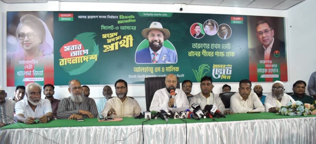 সিলেট-৩ আসনে বিএনপি মনোনীত ধানের শীষের প্রার্থী বিএনপি চেয়ারপার্সনের উপদেষ্টা, যুক্তরাজ্য বিএনপির সভাপতি এম এ মালিক বলেছেন, অতীতে ওয়ান-ইলেভেন সরকারের সহযোগিতায় ক্ষমতায় আসা আওয়ামী লীগ সরকার আমাকে নানাভাবে টার্গেট করে হয়রানি করেছে। আমি বিদেশে অবস্থানকালে আওয়ামীলীগের স্বৈরশাসনবিরোধী আন্দোলন করেছি বলেই আমি ও আমার পরিবারের ওপর একাধিক হামলা-নির্যাতন চালানো হয়। এমনকি মায়ের ও ভাইয়ের মৃত্যুতেও দেশে ফিরতে পারেননি।
