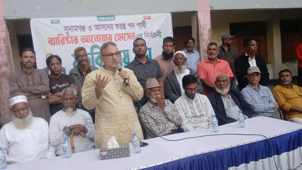 বৃহস্পতিবার বিকালে শান্তিগঞ্জের ডুংরিয়া গ্রামবাসীর উদ্যোগে ডুংরিয়া হাইস্কুল এন্ড কলেজের মাঠে ডুংরিয়া গ্রামের প্রবীন মুরব্বি তারিফ মিয়ার সভাপতিত্বে ও জেলা যুবদলের সদস্য মুফাসসির আহমদ রিয়াদের পরিচালনায় প্রধান অতিথি হিসেবে বক্তব্য রাখেন সুনামগঞ্জ -৩ আসনের স্বতন্ত্র প্রার্থী ব্যারিস্টার আনোয়ার হোসেন।