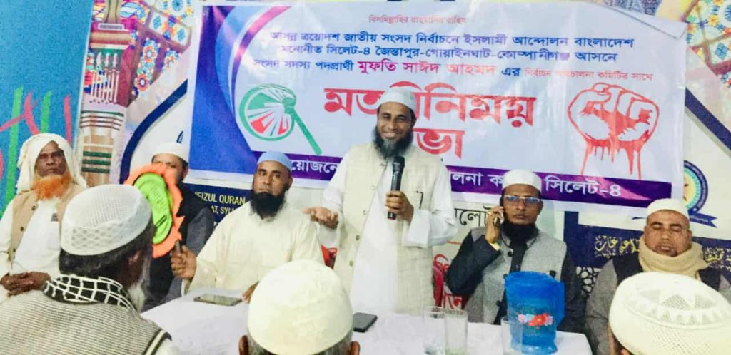 আসন্ন ত্রয়োদশ জাতীয় সংসদ নির্বাচনে ইসলামী আন্দোলন বাংলাদেশ মনোনীত সিলেট-৪ (জৈন্তাপুর–গোয়াইনঘাট ও–কোম্পানিগঞ্জ) আসনে সংসদ সদস্য পদপ্রার্থী মুফতি সাইদ আহমদ জৈন্তাপুরীর সাথে নির্বাচন পরিচালনা কমিটির মতবিনিময় সভা অনুষ্ঠিত হয়েছে।