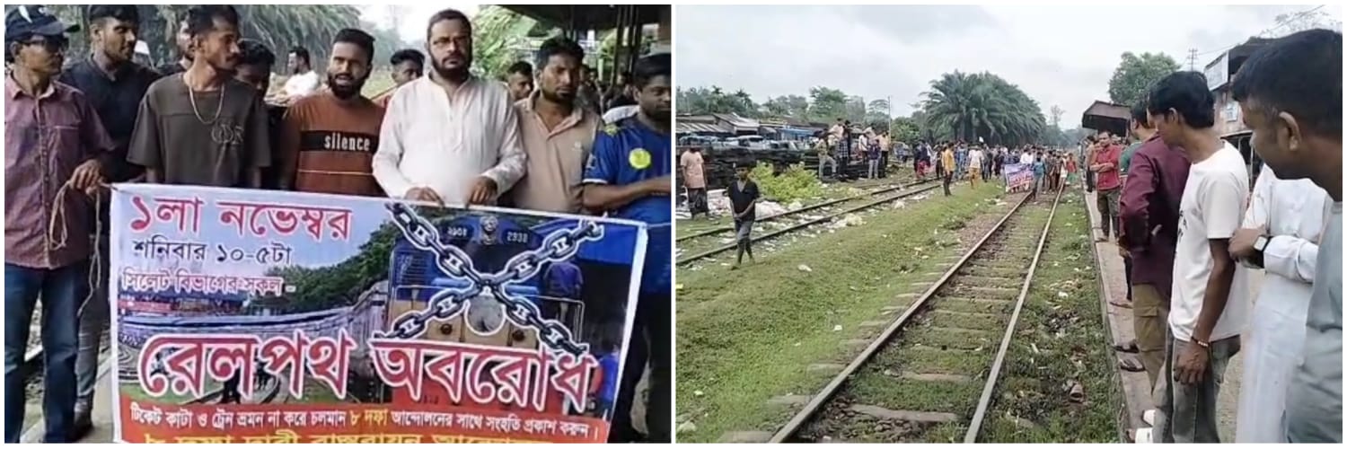 মৌলভীবাজার শমশেরনগর স্টেশনে সংস্কারসহ ৮ দফা দাবিতে রেলপথ অ ব রো ধ