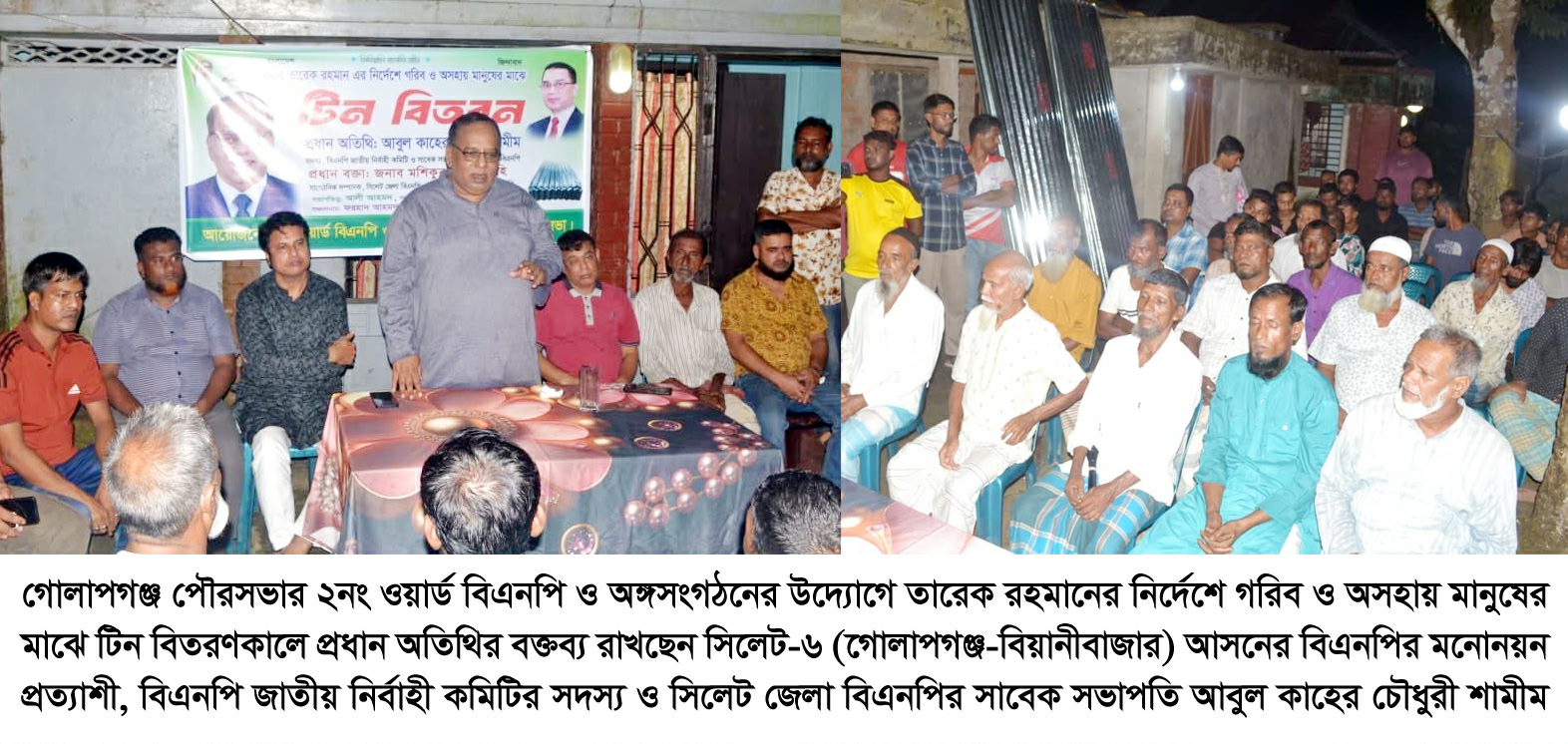 তারেক রহমানের নির্দেশে গরিব ও অসহায় মানুষের মাঝে টিন বিতরণ সিলেট-৬ (গোলাপগঞ্জ-বিয়ানীবাজার) আসনের বিএনপির মনোনয়ন প্রত্যাশী, বিএনপি জাতীয়