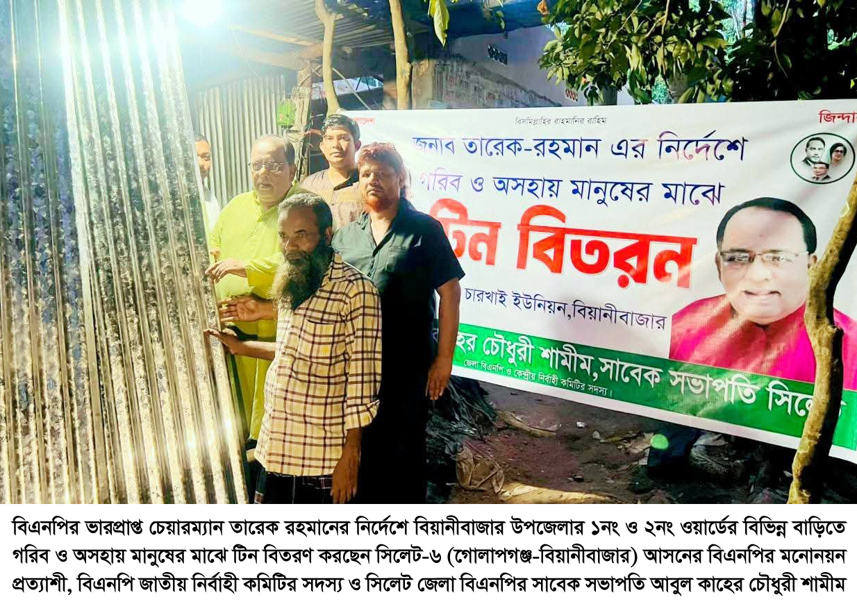 বিয়ানীবাজার উপজেলার গরিব ও অসহায় পরিবারের মাঝে ঢেঊটিন বিতরণ অসহায় মানুষের মুখে হাসি ফেরাতে বিএনপির সরকার প্রতিষ্ঠা করা এখন সময়ের