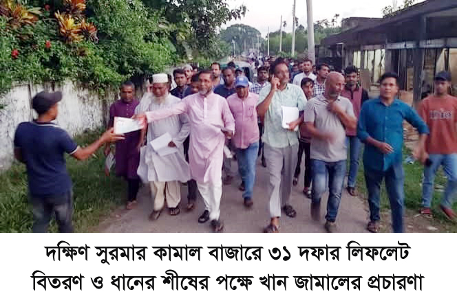 দক্ষিণ সুরমার কামাল বাজারে ৩১ দফার লিফলেট বিতরণ ও ধানের শীষের পক্ষে খান জামালের প্রচারণা