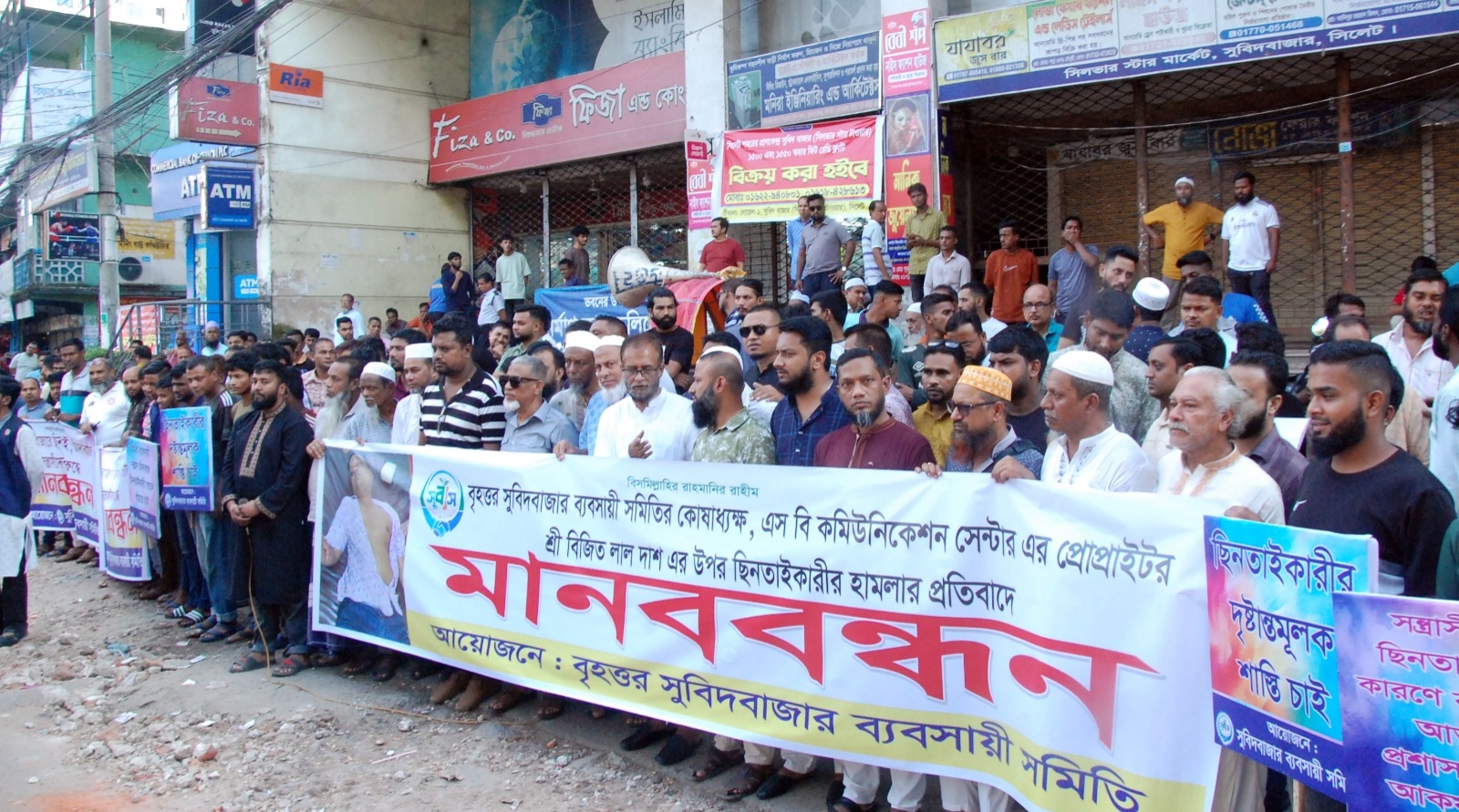 বিজিত লাল দাশ এর উওর ছিনতাইকারীদের হামলার প্রতিবাদে বৃহত্তর সুবিধাজার ব্যবসায়ী সমিতির মানববন্ধন
