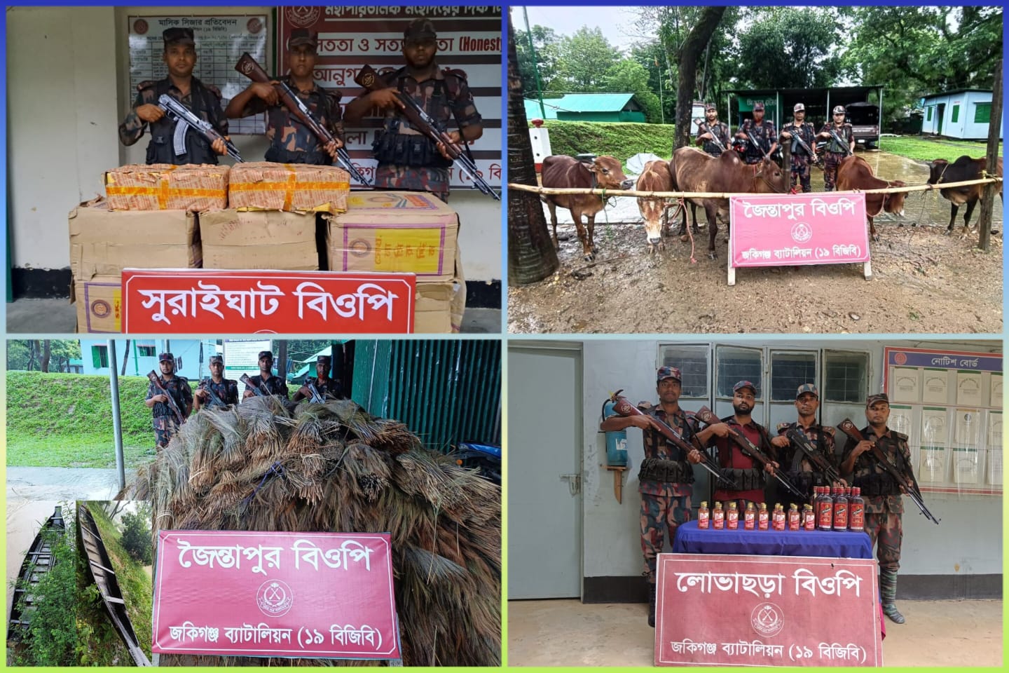 জৈন্তাপুর- সংবাদদাতা : :: সিলেট সীমান্তের বিভিন্ন স্থানে অভিযান চালিয়ে সাড়ে ১৭ লাখ টাকার ভারতীয় গরু, মদ ও বিভিন্ন রকম